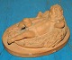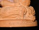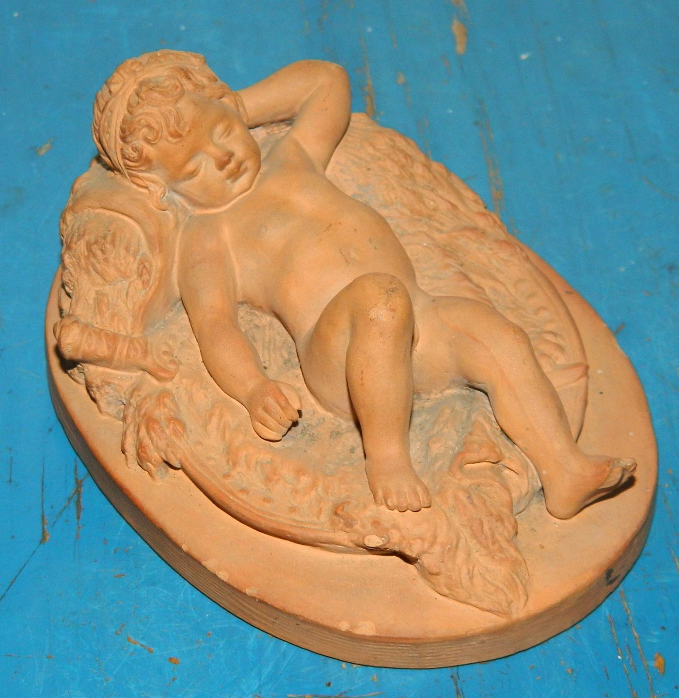 Figur i terracotta fra Peter Ipsen, Kjøbenhavn, forestillende sovende dreng. Har nogle små skår på kanterne, der ses på fotografier samt skår på venstre albue. Fabriksstemplet på bunden. 5 cm høj og 11 cm lang.