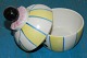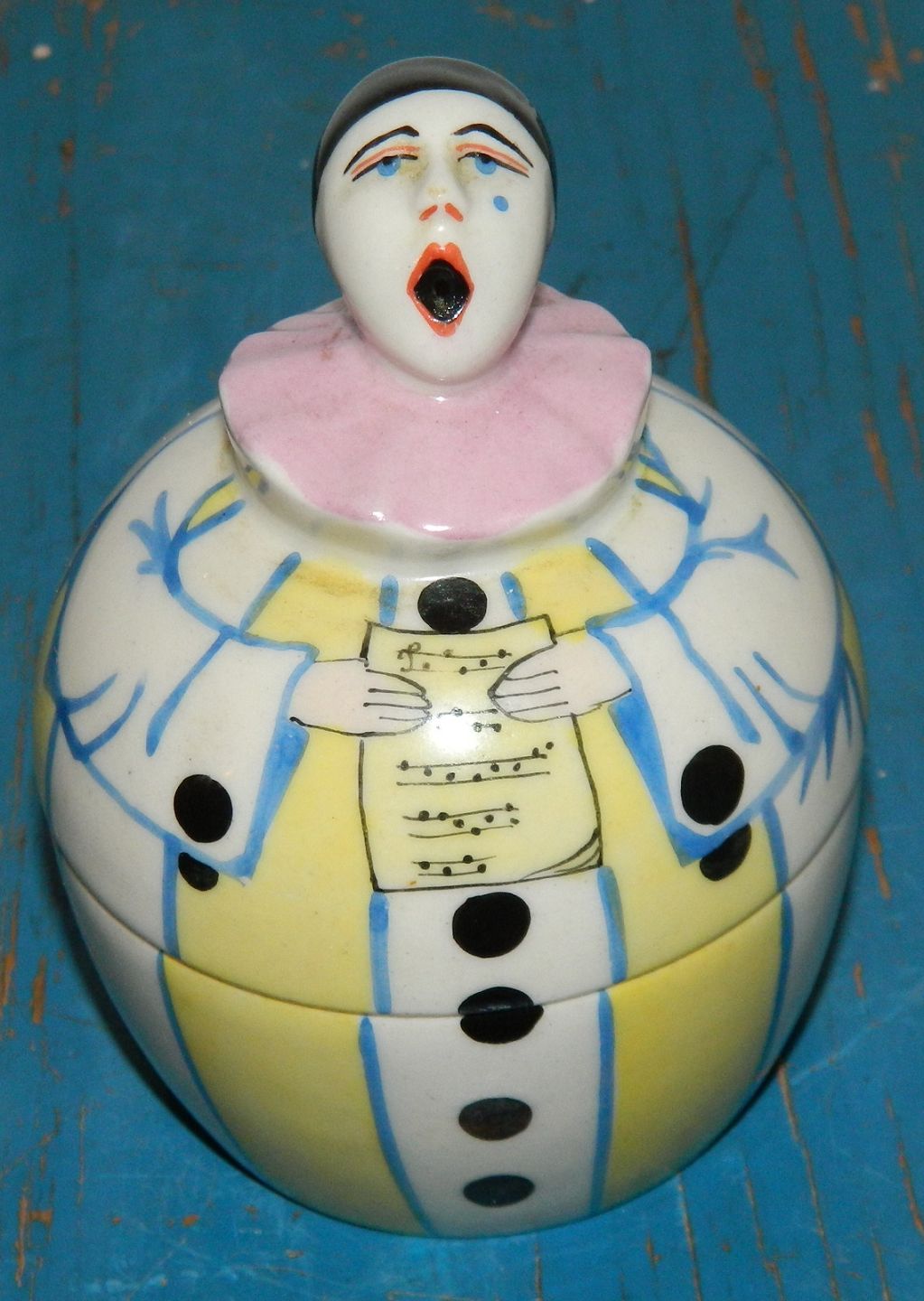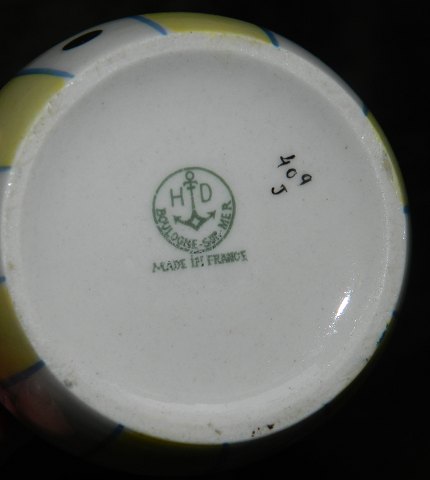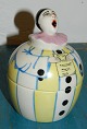 Fransk Art Deco: Lågskål i porcelæn fra Frankrig. Forestillende syngende klovn, Pjerrot, i stærke farver. Fremstår i perfekt stand. Fabriksmærket med H.D Henri Delcourt, anchor, Boulogne-Sur-Mer, Made in France. Made around 1920. 12 cm høj.