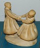 Figur i terracotta af par dansende piger. Fremstillet hos P. Ipsen, Kjøbenhavn, ca. 1900. Fremstår i god stand uden skader eller reparationer. Fabriksmærket på bunden. Mål: 15 cm høj. Basen måler 10 cm x 14 cm.