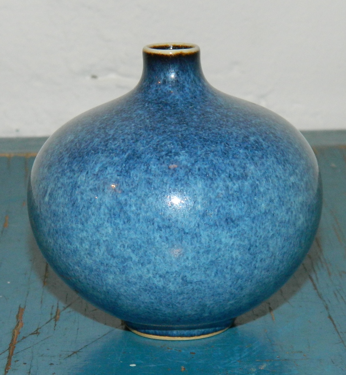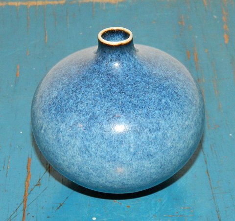 Mindre buttet blå stentøjsvase af Nils Thorsson for Royal Copenhagen. Fremstår i god stand. Fabriksmærket på bunden. 1. sortering. 7½ cm høj.