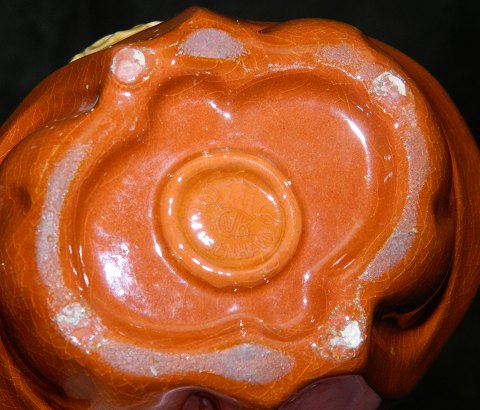 Skål i keramik fra den bornholmske lervarefabrik Michael Andersen & Søn. Vasen udført for Grosser C. V. Kjær omkring 1920. Dekoreret med blomst samt par figurer af mus på kanten. Fremstår i god stand. Signeret med CVK´s velkendte røde segl på bunden. 12 cm høj.