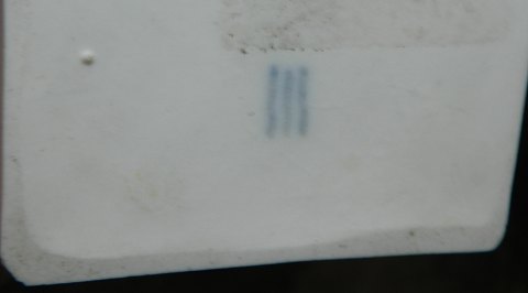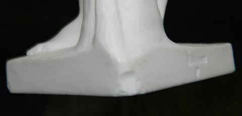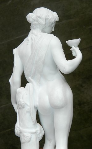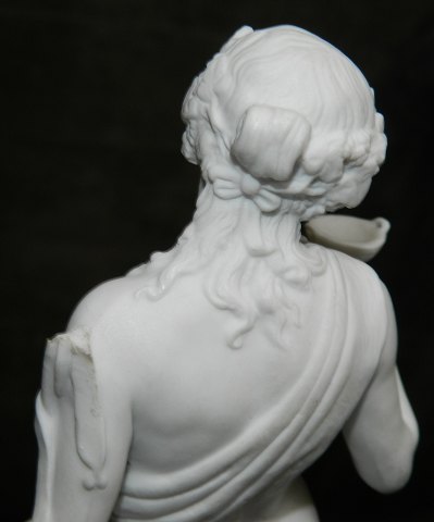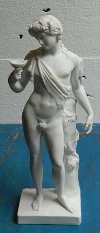 Figur i bisquit af Bacchus fra Royal Copenhagen. Skabt af Bertel Thorvaldsen i Rom 1804. Reproduktion fra Royal Copenhagen ca. 1880. Lille bid af klædning mangler ved venstre skulder ligesom der er et par mindre skår på soklens hjørner, hvilket fremgår af fotografierne. Fabriksmærket på bunden med de tre bølger i blåt. Indstemplet ENERET på bagsiden af soklen. Figuren er 20½ cm høj.