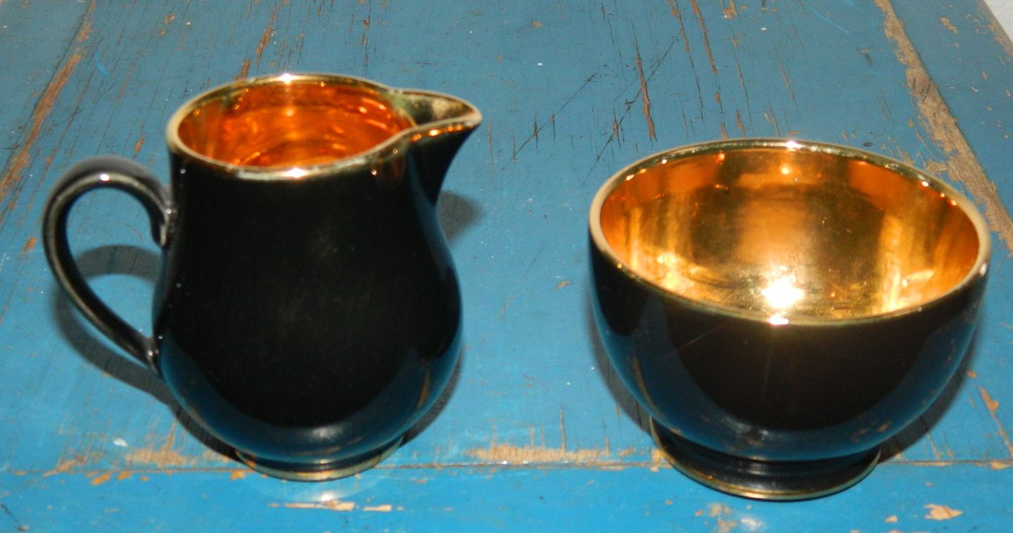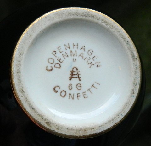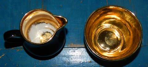 Sukker -og flødesæt i Confetti fra Aluminia. Sort med gulddekoration indvendigt. Guldet er noget slidt på kanden ! Ingen skader eller reparationer. Fabriksmærkede på undersiden. Kanden er 7 cm høj.