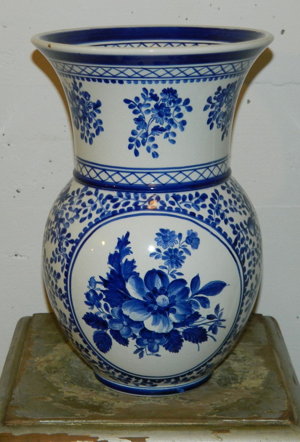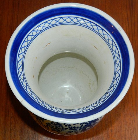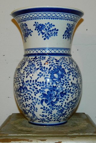 Vase i fajance fra Aluminia med Eremitage-dekoration fra omkring 1920. Fremstår i god stand med almindeligt brugssslid. Herunder mindre hårrevne på kanten (se både indvendigt og udvendigt) samt meget lille glasurafslag på kanten (se foto). Fabriksmærket på bunden med EREMITAGE KØBENHAVN samt svagt indstemplet ALUMINIA. Vasen er 28½ cm høj.