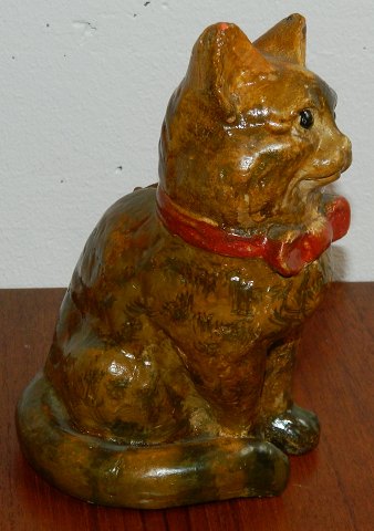 Sparebøsse i keramik i form af siddende kat. Fremstår i god stand uden skader eller reparationer. Fremstillet omkring 1920. 17 cm høj.