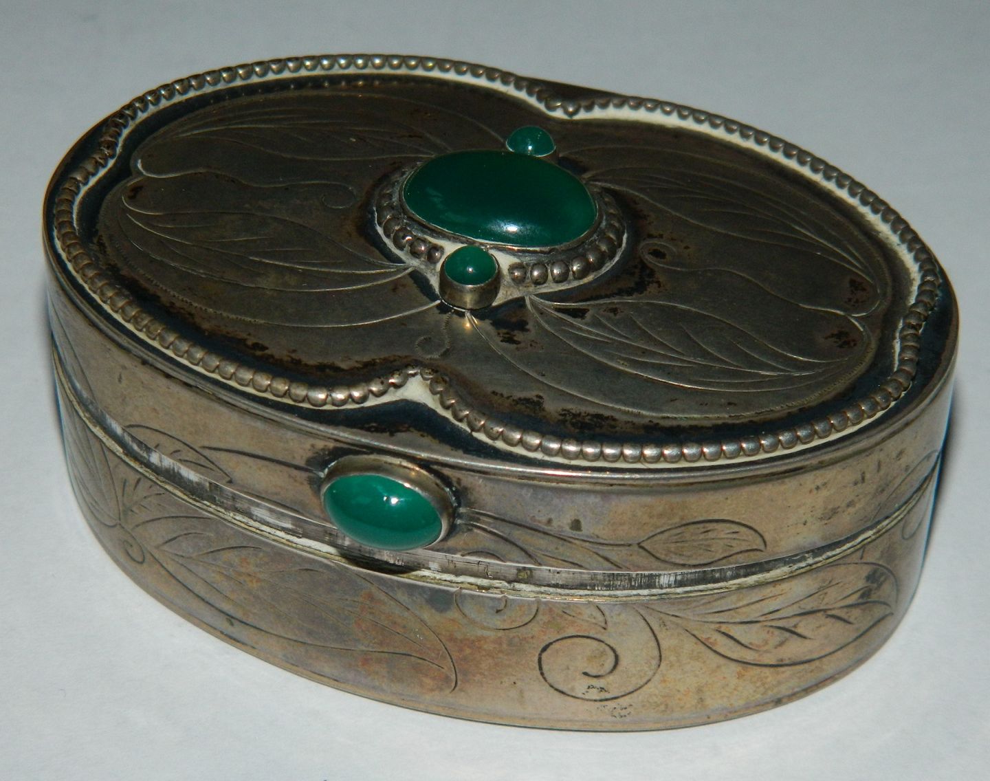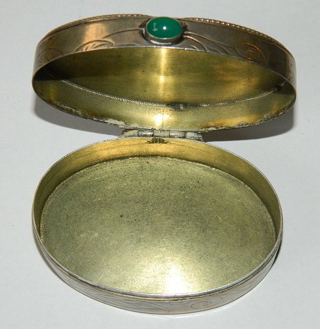 Æske med låg i sølv i sølv med indridset dekoration samt to grønne sten. Fremstår i god stand uden skader eller reparationer. Sølvstemplet på bunden m.m. Mål: 8 cm lang, 6 cm dyb og 3 cm høj.