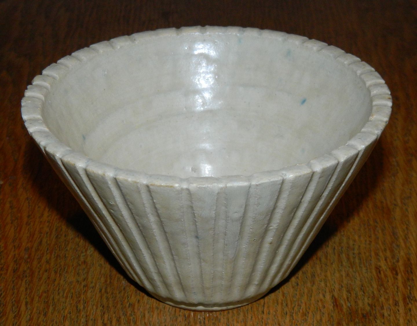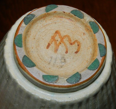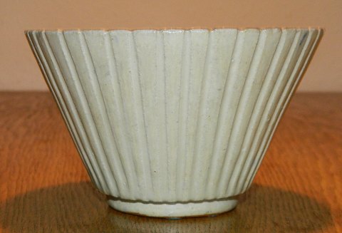 LIGNENDE KØBES: Skål i keramik fra Arne Bang. Vertikale riller rundt om skålen, der er dækket af en lys cremefarvet glasur. Fremstår i god stand. Kunstnersignatur på bunden. 8 cm høj og åbningsdiameter på 13½ cm.