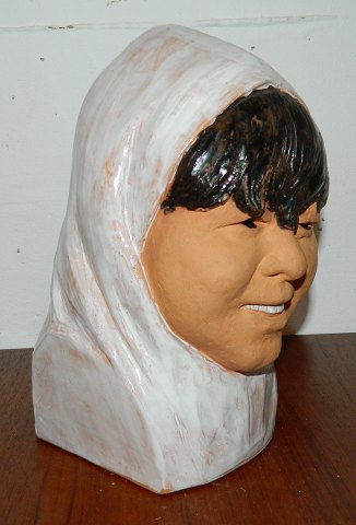 Buste i keramik af dreng i nationaldragt fra Grønland. Fremstår i god stand uden skader eller reparationer. Signeret af ubekendt kunstner J. B. i 1950. Fabriksmærket på indersiden. 23½ cm høj.
