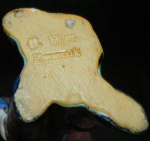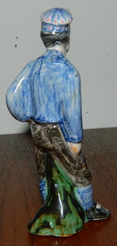 Figur af ung mand fra Færørene med hat og fiskekniv i ved hoften. Fremstillet for L. Hjorth. Fremstår i god stand uden skader eller reparationer. Fabriksmærket på bunden. 12 cm høj