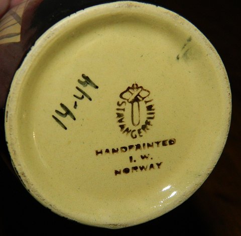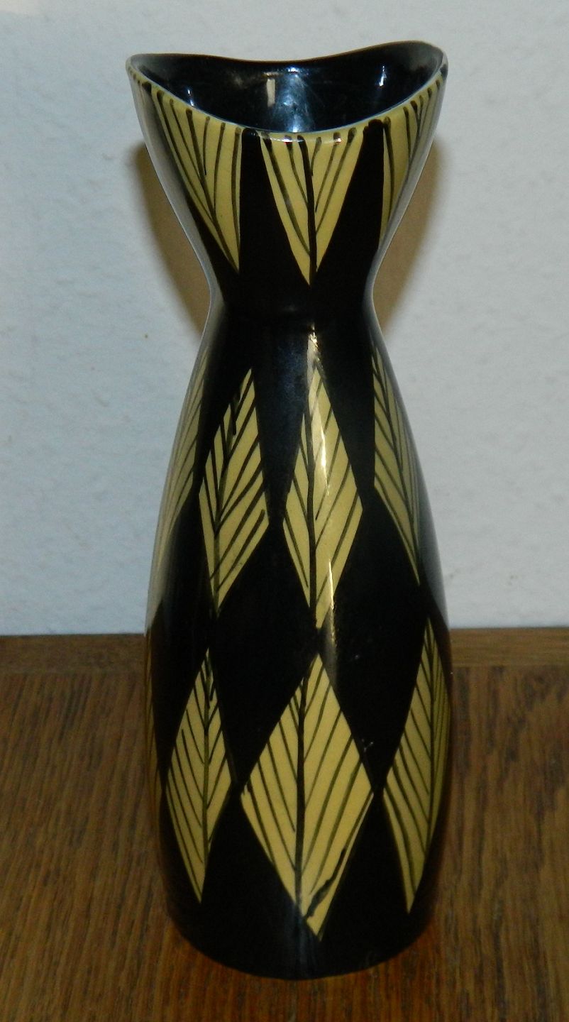 Vase i fajance fra Stavangerflint i Norge designet af Inger Waage. Sort med gul bladdekoration. Fremstår i perfekt stand. Fabriksmærket og kunstnerinitialer I.W. på bunden. 19 cm høj.