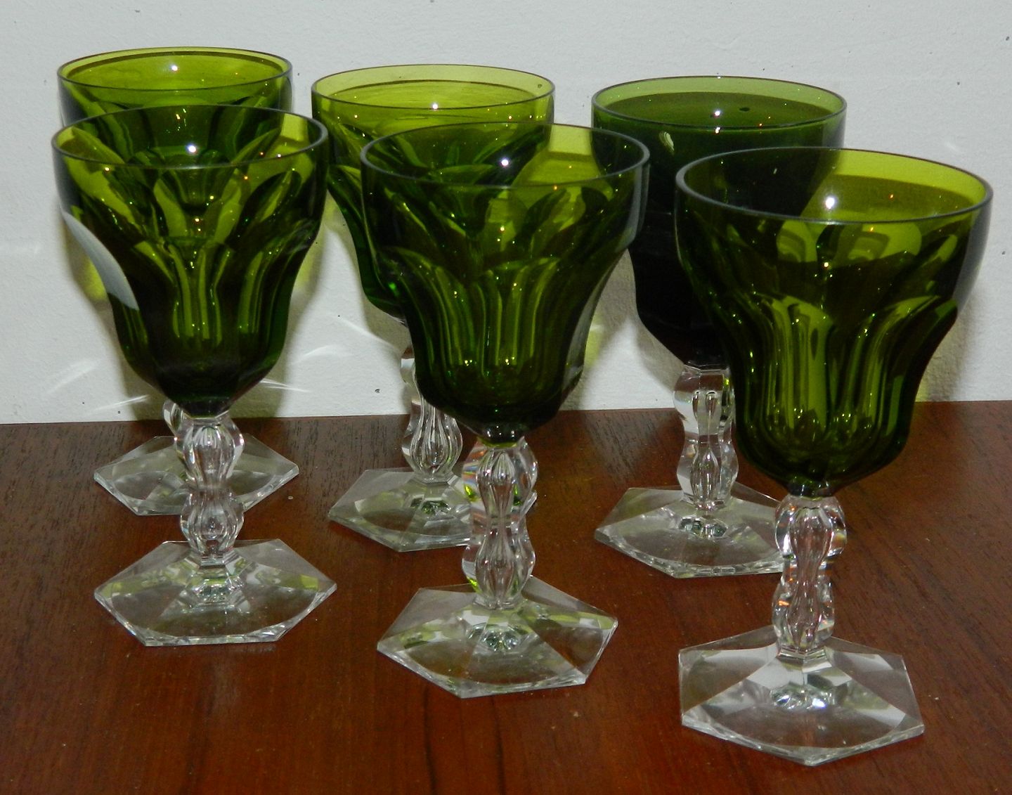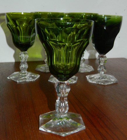 Seks stk. "Lalaing" grønne hvidvinsglas fra Holmegaard. Eet mørkere end de andre ! Ingen skader eller reparationer. Midt 20. årh. H. 13 cm.