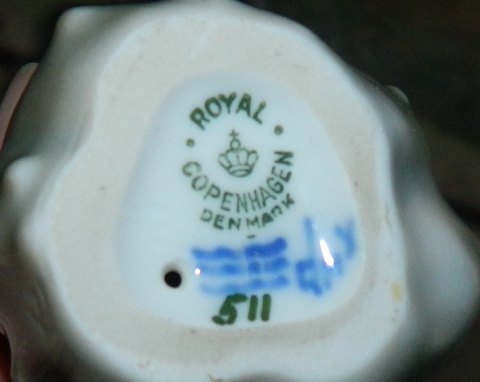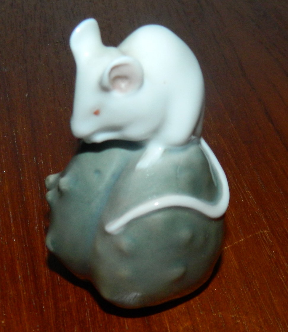Figur af hvid mus siddende på kastanie i porcelæn fra Royal Copenhagen. 2. sortering. Fremstår i god stand uden skader eller reparationer. Fabriksmærket på bunden. 6½ cm høj.