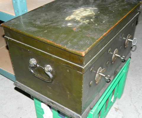Pengekiste eller skrin / opbevaringsboks i metal og træ. Tre låse ! To hanke. Fremstår i god stand. Almindeligt brugsslid. Fremstillet omkring 1900. Mål: Længde: 49 cm Dybde: 34 cm Højde: 28 cm.
