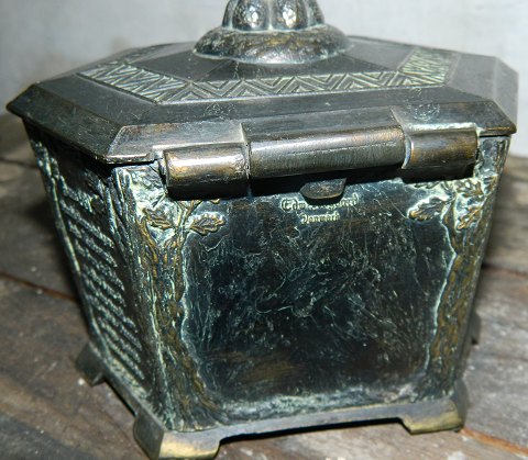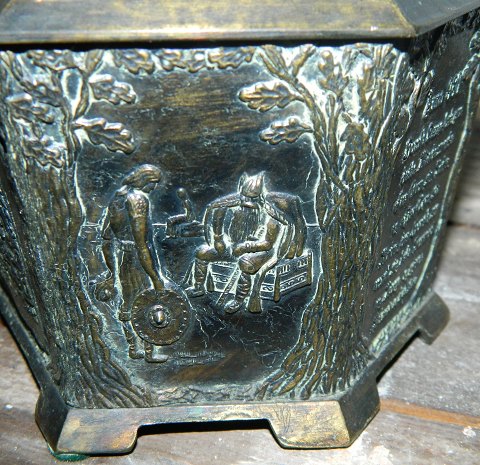 Vikinger: Metalskrin (broncelignende) med motiver fra vikingtiden samt stensætning på toppen af låget. I god stand. 13 cm høj.