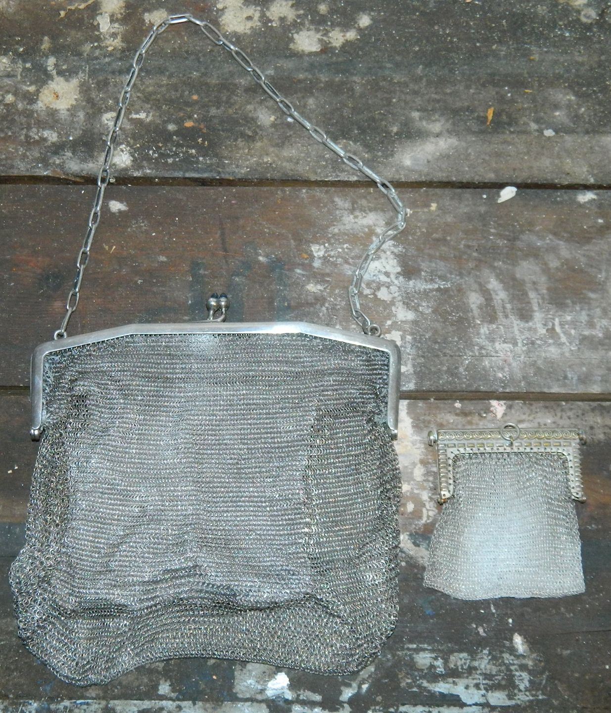 Taske -og pung i metal. Ikke sølv. Begge i god stand uden skader. Fra omkring 1920. Tasken måler 16 cm x 16 cm.