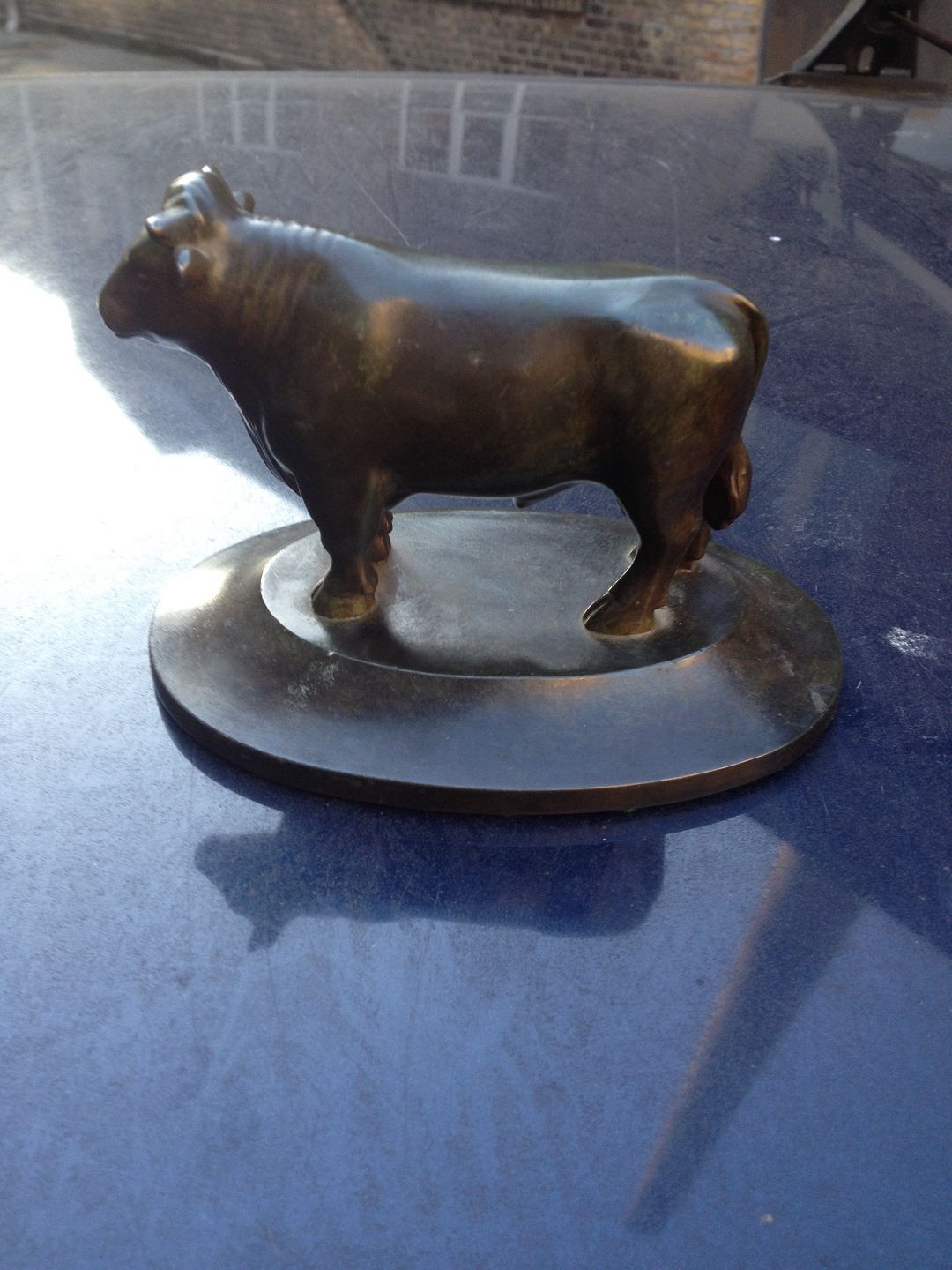 Figur af tyr af Just Andersen. Udført i diskometal med en broncepatineret overflade. Fremstår i perfekt stand. Indgraveret tekst på siden af basen Bl.a. 1942. Mål: 9 cm høj - basen er 13 1/2 cm lang.