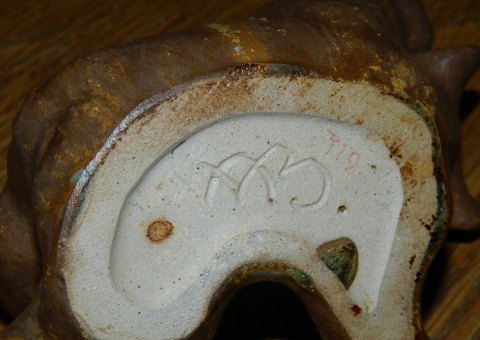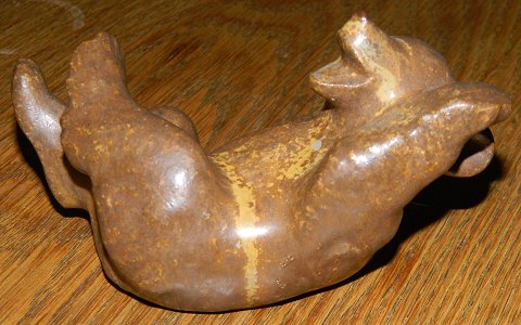 Figur i keramik af bjørn fra Arne Bang. Dækket af brun glasur. Fremstår i perfekt stand. Mål: 7½ cm høj og 13½ cm lang. Fabriksmærket på bunden.