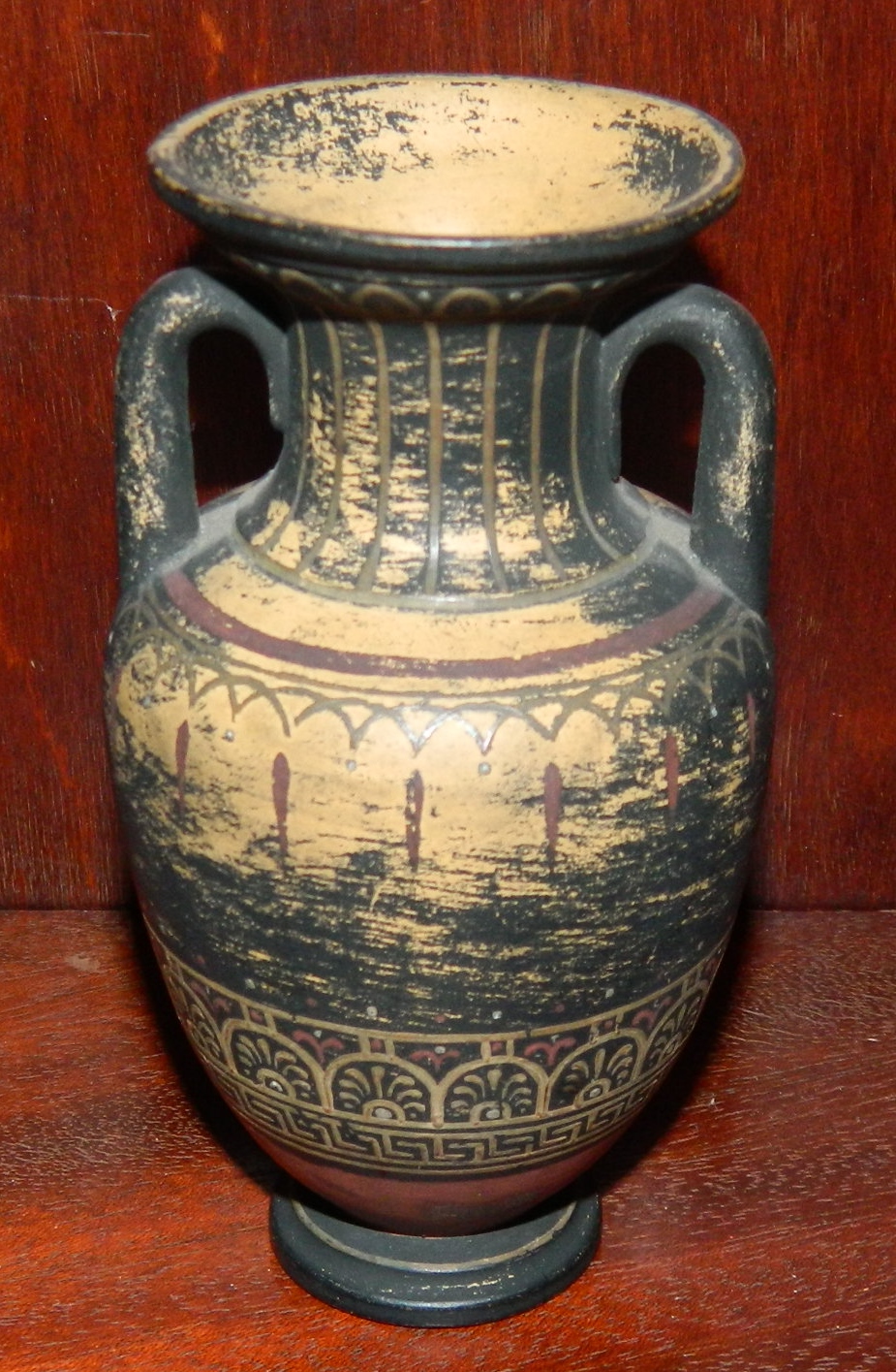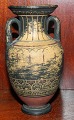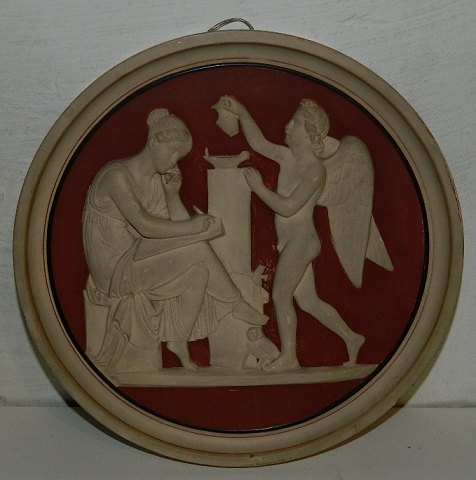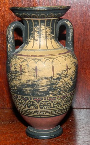 Lille krukke i terracotta med hanke. Fremstillet i slutningen af 19. århundrede. Fremstår i god stand. Bemaling dog med brugsslid. Fabriksmærket på bunden med "P. Ipsen". 11½ cm høj.