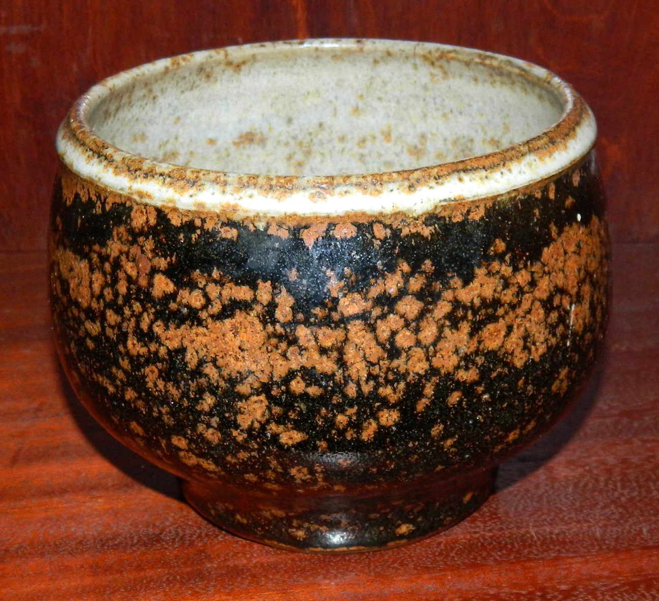 Skål i stentøj af norske Erik Pløen. Dekoreret med lys brun spættet glasur på mørk brun bund. Indvendigt i lys glasur. Let kalket indvendigt efter brug. Ingen skader eller reparationer. Signeret af kunstneren med "PLØEN" på bunden samt NORWAY. Skålen er 11 cm høj og 14 cm i åbningens diameter.