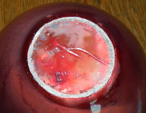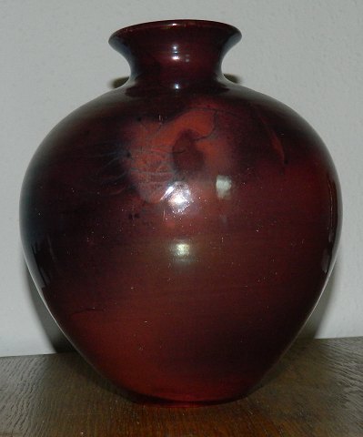 Rund vase i keramik fra Kähler fabrikken i Næstved ca. 1920. Dækket af en delvist (under overfladen) krakkeleret rød lustreglasur. Har to små "nålestik" i glasuren. Ingen skader eller reparationer. Fabriksmærket på bunden med det velkendte HAK samt DANMARK.
