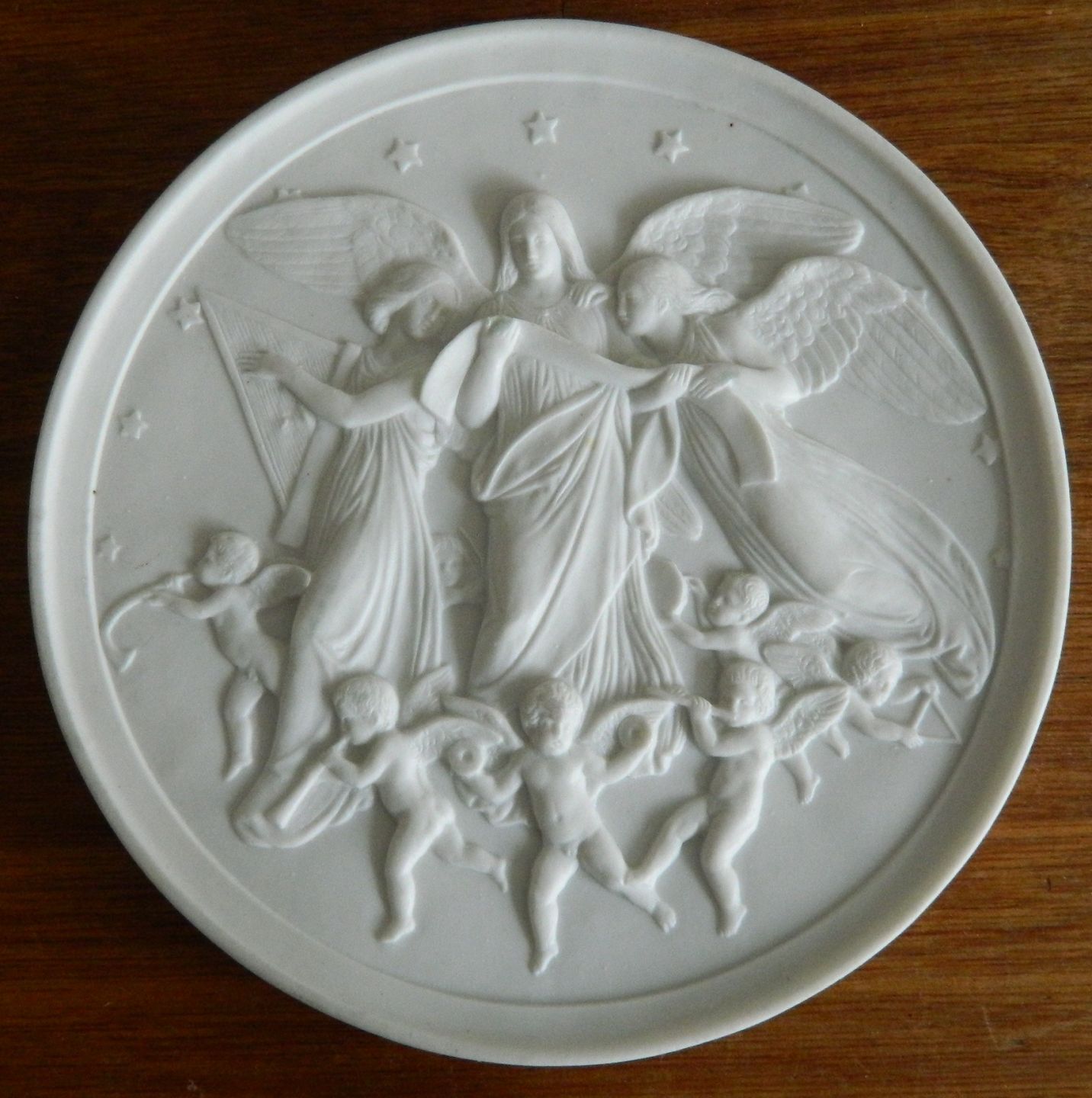 Bing & Grøndahl platte i bisquit af Bertel Thorvaldsen (1770-1844) med "Juleglæde i Himlen" Efter relief modelleret på Nysø Slot 1842. Platten fremstår i perfekt stand. Fabriksmærket på bagsiden. Fremstillet i slutningen af 19. århundrede. 14½ cm i diameter.