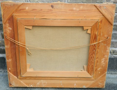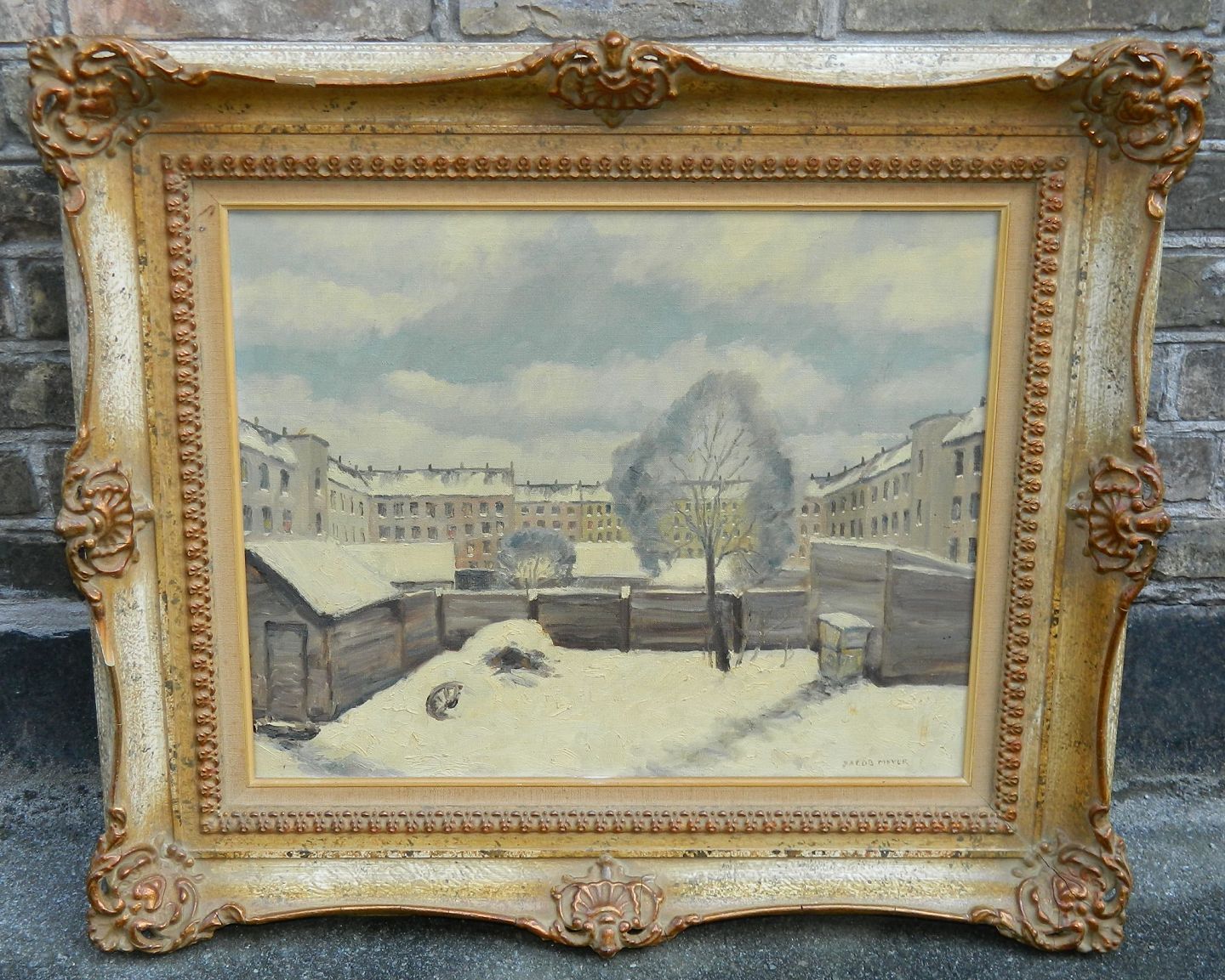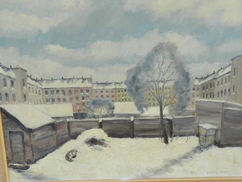 Oliemaleri på lærred af Jacob Meyer (1895-1971). Motiv med snedækket gårdmiljø fra København, nærmere Nørrebro. Malet ca. 1940. Lærred og ramme i god stand. Signeret af kunstneret i nederste højre hjørne. Mål: Incl. ramme 62 cm x 71 cm. Uden ramme: 45