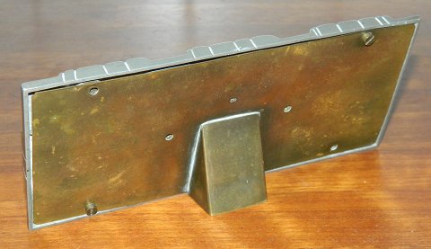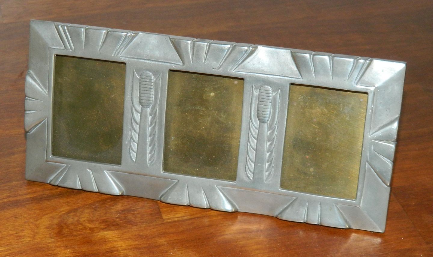 Billedramme til tre foto´s i tin fra omkring 1900. Glassene mangler. Bagbeklædning i messing. Dekoreret i skønvirkestil. Fremstillet hos Mogens Ballin (1871-1914) på hans eget værksted. Ingen skader eller reparationer. Fabriksmærket med MB uden modelnummer. Mål: 9 cm høj og 20 cm lang.