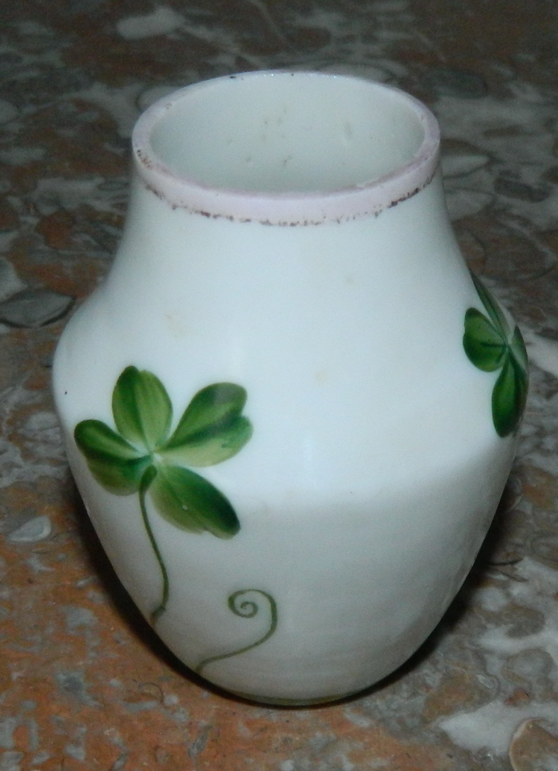 Lille vase i hvid opaline glas fra Fyens Glasværk. Dekoreret med firkløvere. Fremstår i god stand uden skader eller reparationer. 8 cm høj.