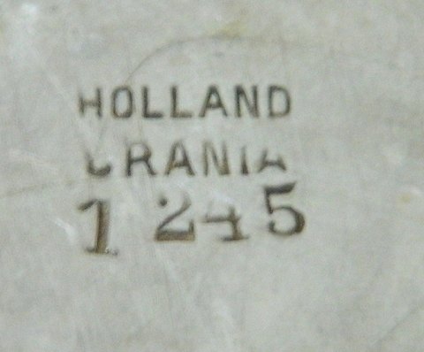 Rendyrket jugend fra Nederlandene: Holder til teglas i tin fremstillet i begyndelsen af 20. århundrede. Fremstår i god stand med almindeligt brugsslid. Fod lettere bukket. Ingen skader. Erindringshilsen indridset med navn på forsiden. Fabriksmærket på bunden med HOLLAND URANIA samt modelnummer 1245. Mål: 9 cm høj.
