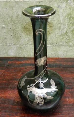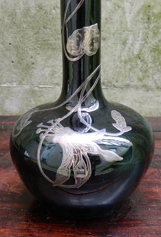 Art Nouveau perioden: Langhalset vase i keramik med floral dekoration af indlagte svungne blomster i sølv. Metalarbejde og vasen fremstår i god stand uden skader eller reparationer. Der ses dog et par ridser på vasen hvilket fremgår af foto. På bunden modelnummer. Formoder den er fremstillet omkring 1900 i mellem-Europa - muligvis Frankrig eller Belgien ! Vasen er 20 cm høj.