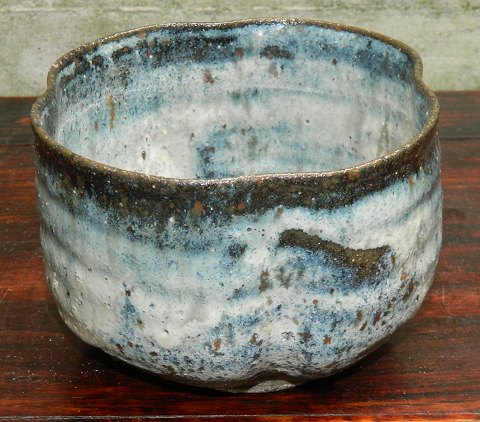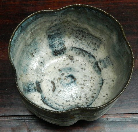 Højsiddet skål i keramik af Gutte Eriksen. Løbende blålig glasur, der stopper inden bunden nås ! Hvidlig glasur indvendigt. Fremstår i perfekt stand. Kunstnerens signatur - stempellogo - på bunden. H. 8 cm Ø. 12 cm.