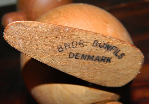Figur i træ af trold fra Brdr. Bonfils. Fremstår i god stand. Har en lille skramme på ydersiden af den ene fod, hvilket fremgår af foto. Fabriksmærket på undersiden. Figuren er 15 cm høj.