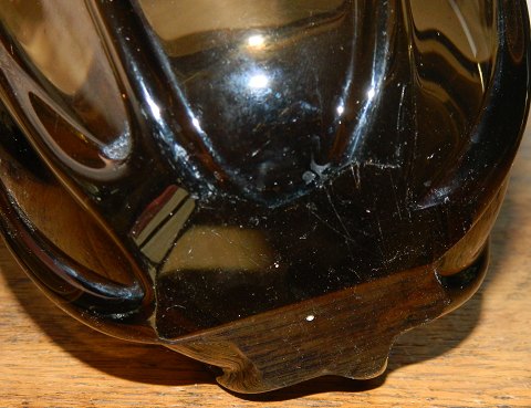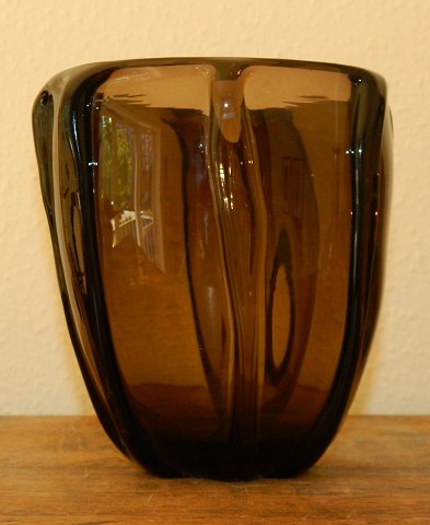 Vase i kunstglas fra Holmegaard Glasværk. Designet af Jacob E. Bang i 1930´erne. Brunt glas dekoreret med lange lodrette "pølser" rundt om vasen. Fremstår i perfekt stand. Mål: H. 16½ cm Ø. 14½ cm
