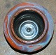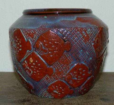 Vase i keramik af Gudrun Meedom (1915-2011). Dekoreret med stime af fladfisk i relief. Herpå delvist dækket af blålig glasur. Fremstår i perfekt stand uden skader eller reparationer. Vasen er 13 cm høj og bredest diameter på 15 cm. Åbningsdiameter på 9 cm. Signeret af kunstneren på bunden med indridset GMee.