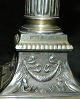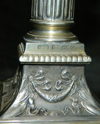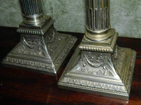 Lysestager i Empire-stil: Par lysestager i sølv / sølvplet fra WMF, Württembergische Metallwarenfabrik, Geislingen, Tyskland. Kanallerede piber og rigt dekoreret på de firkantede fødder. Løse lysmanchetter. Fremstillet omkring 1900. Fremstår i perfekt stand. Ingen skader eller reparationer. Begge fabriksmærkede hvilket fremgår af foto´s. Stagerne er 18½ cm høj. Fødderne måler 9 cm x 9 cm.