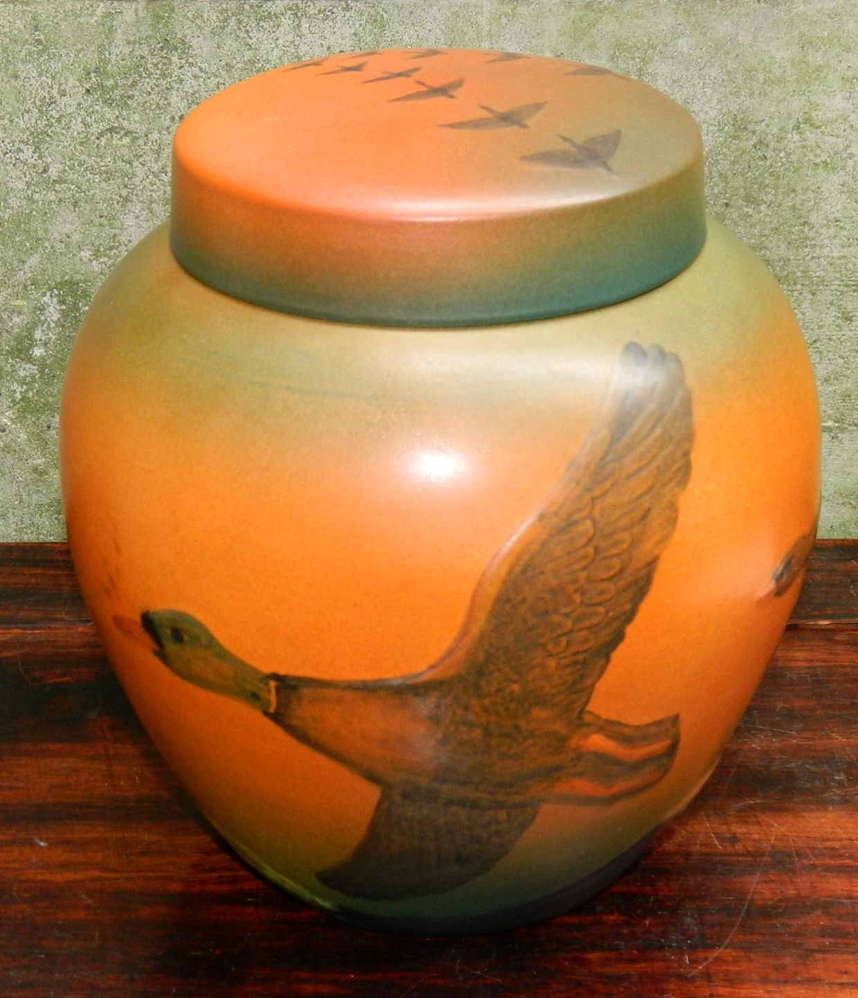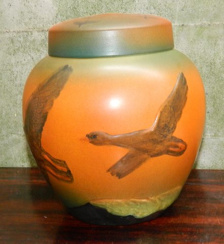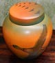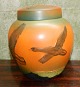 Krukke med låg eller urne fra Peter Ipsen´s Enke fra ca. 1930. Dekoreret med ænder. Fremstår i perfekt stand. Fabriksmærket på bunden sammen med modelnummer 762. Mål: 18½ cm høj. Diameter midt på krukken 16 cm.