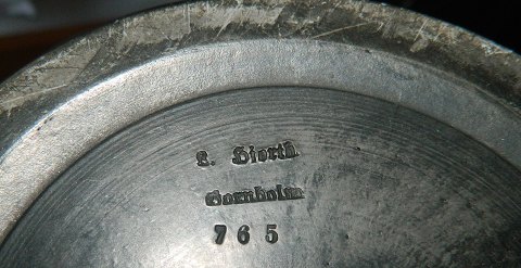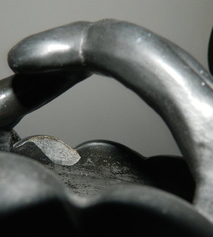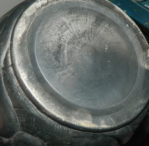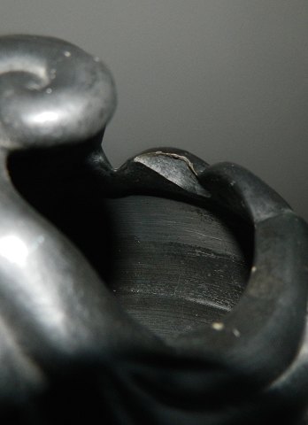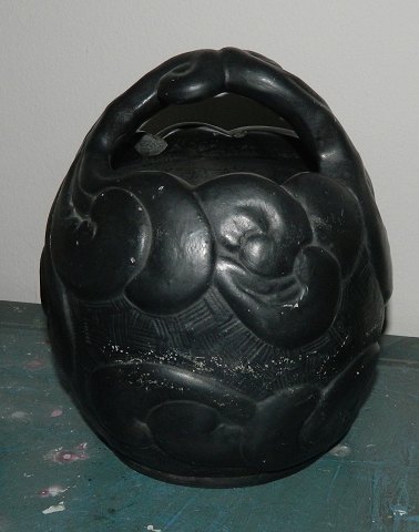 Sort krukke i keramik med overliggende hank fra Lauritz Hjorth, Bornholm, ca. 1900. Dekoreret i skønvirkestil af Thorvald Bindesbøll. Fremstår med skår på indersiden af øverste kant (se foto). Ellers uden skader eller reparationer. Fabriksmærket på bunden. 21,5 cm høj
