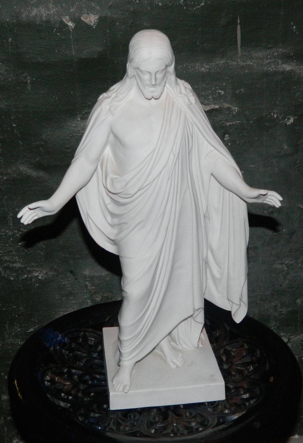 Figur af Kristus i bisquit af Bertel Thorvaldsen (1770-1844) for Royal Copenhagen. Fremstillet i andenhalvdel af 19. århundrede. Fremstår i god og hel stand. Ingen afslag eller andre skader. Fabriksmærket med de velkendte tre bølger for R.C. på undersiden. 35 cm høj.