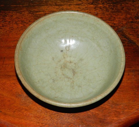 Skål i keramik fra Kina 17.-18. århundrede. Dækket af celadonglasur såvel indvendigt som udvendigt. Utydelig dekoration i bunden. Uden skader eller reparationer. 7,5 cm høj samt 15,5 cm i åbningens diameter.