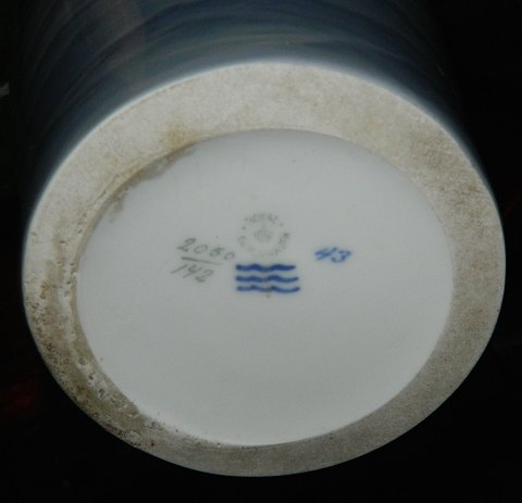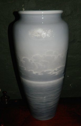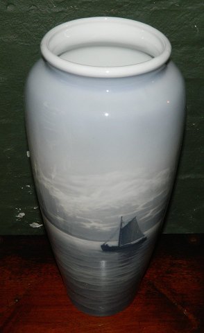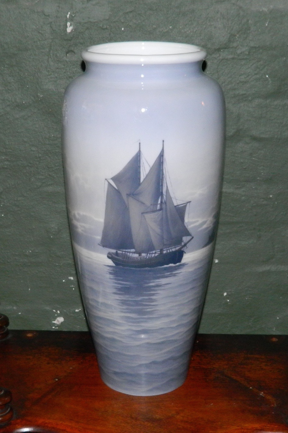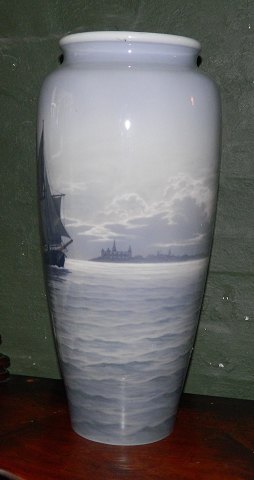 Stor vase i porcelæn fra Royal Copenhagen skønvirkeperioden 1900-1923. Motiv med sejlskib, mindre båd og Kronborg i baggrunden. Fremstår med defekt på bagsiden i overfladen (se foto). Derudover 2. sortering. Fabriksmærket på bunden.