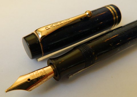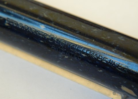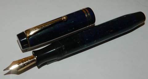 Lille blå marmoreret Parker Duofold fyldepen fra 1930´erne. Velholdt. Fremstår i god stand. Alle dele original Parker. Ny gummisæk skal indsættes før brug. Ved tillæg på kr. 325,00 kan fyldepennen leveres med ny gummisæk. 11 cm lang.