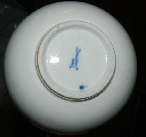 Fløde eller mælkekande i porcelæn med høj hank fra Meissen, Tyskland, ca. 1900. Dekoreret med løgmønster samt guldstaffering. Fremstår i god stand uden skader eller reparationer. Fabriksmærket på bunden. 14 cm høj