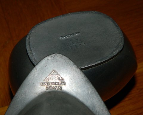 Vase og skål i tin fra Just Andersen. Begge i god stand med almindeligt brugsslid. Ingen skader. Begge fabriksmærkede. Vasen er 9 cm høj og skålen er 21 cm lang.