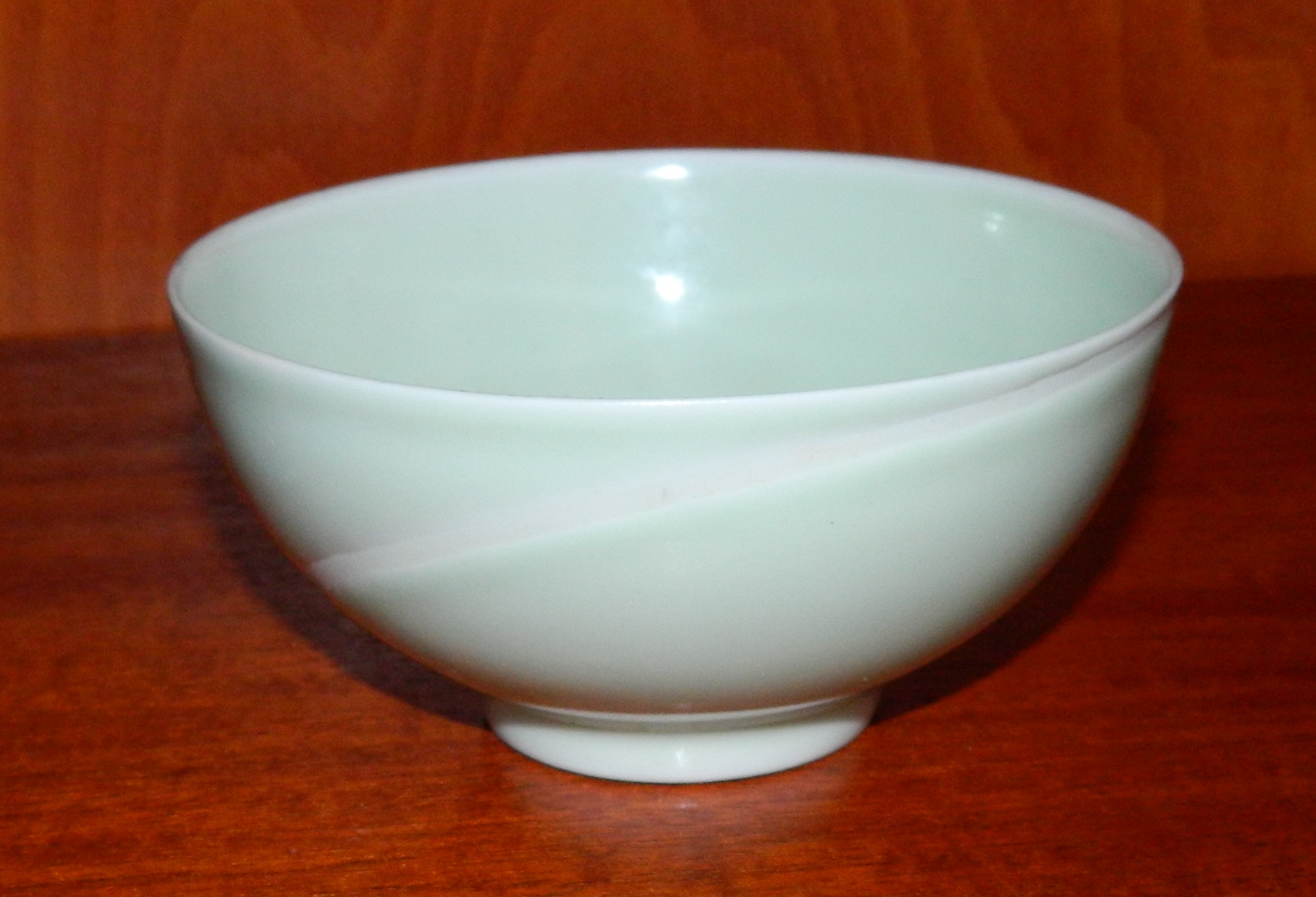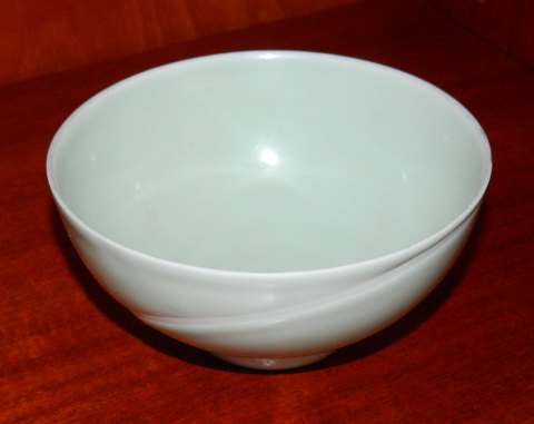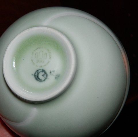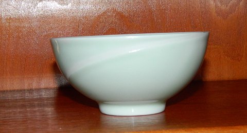 Skål i porcelæn dækket af en sart pastelgrøn glasur. Heri hvid fuge som dekoration rundt om skålen. Fremstillet af Richard Kjærgaard (1919-1999) for Bing & Grøndahl. Fremstår i perfekt stand. 1. sortering. Fabriksmærke samt kunstnersignatur. Mål: cm høj og 12 cm i åbningens diameter.