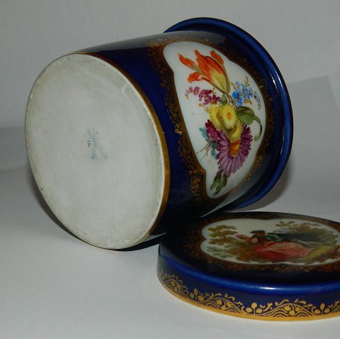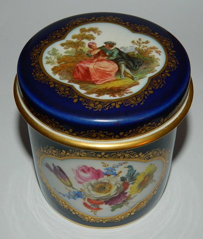 Bemalet lågskål i porcelæn fra ca. 1900. Fremstillet for Meissen, Tyskland, ca. 1900. Dekoreret på to sider med blomster. På låget dekoration med ungt par i stærke farver. 1. sortering. Fabriksmærket på bunden. Mål: 9 cm høj og bunden er 7½ cm i diameter.