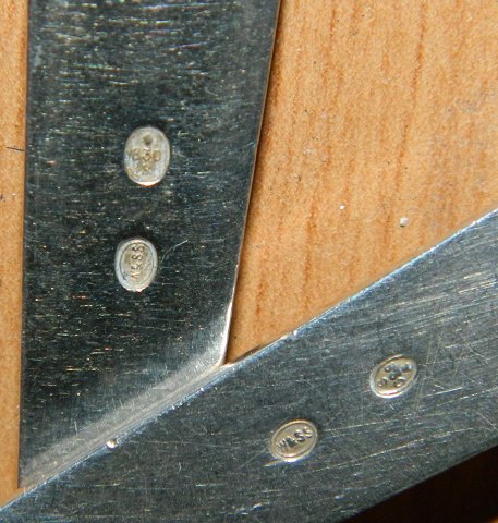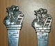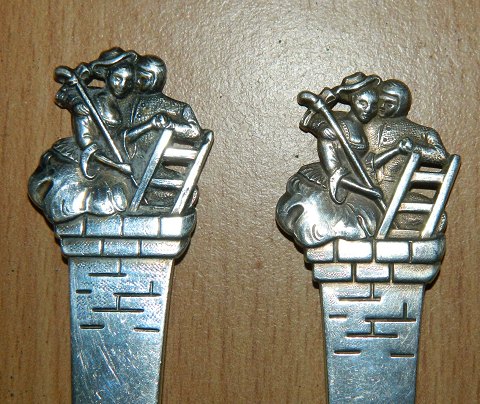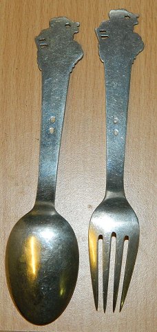 Børnesæt i sølv: Ske og gaffel. Med Hyrdinden og Skorstensfejeren fra H. C. Andersens eventyr. Begge dele i god stand uden skader. Sølvstemplet på bagsiden. Skeen er 14½ cm lang.