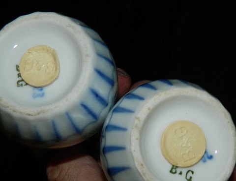 Salt -og pebersæt i musselmalet porcelæn fra Bing & Grøndahl. Fabriksmærket på bunden. Peberbøssen er 10 cm høj.