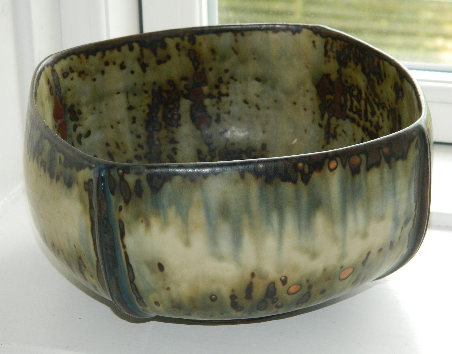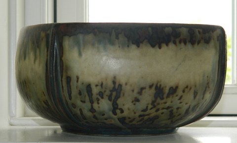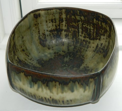 Skål i stentøj fra Royal Copenhagen designet af Ivan Weiss. Dækket af Sung glasur. Fremstår i perfekt stand. 1. sortering. Fabriksmærket på bunden samt indridset kunstnerens signatur IW. Mål: 11 cm høj samt 20 cm x 20 cm.