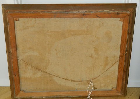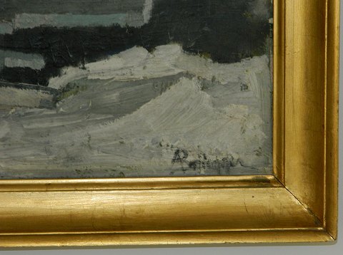 Oliemaleri på lærred med vintermotiv - to personer der skovler sne. Signeret men ubekendt kunstner. Lærred og rame i god stand. Mål 80 cm x 99 cm incl. den kraftige ramme i træ.