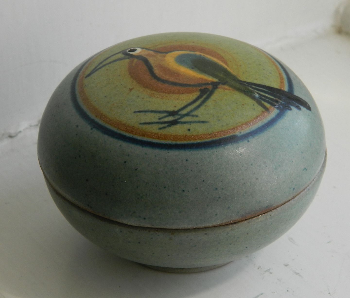 Lille lågskål på fod i keramik fra Dybdahl keramik med dekoration af fugl på låget. Fremstår i perfekt stand. Fabriksmærket på bunden. Mål: 6 cm høj og 8 cm i diameter.